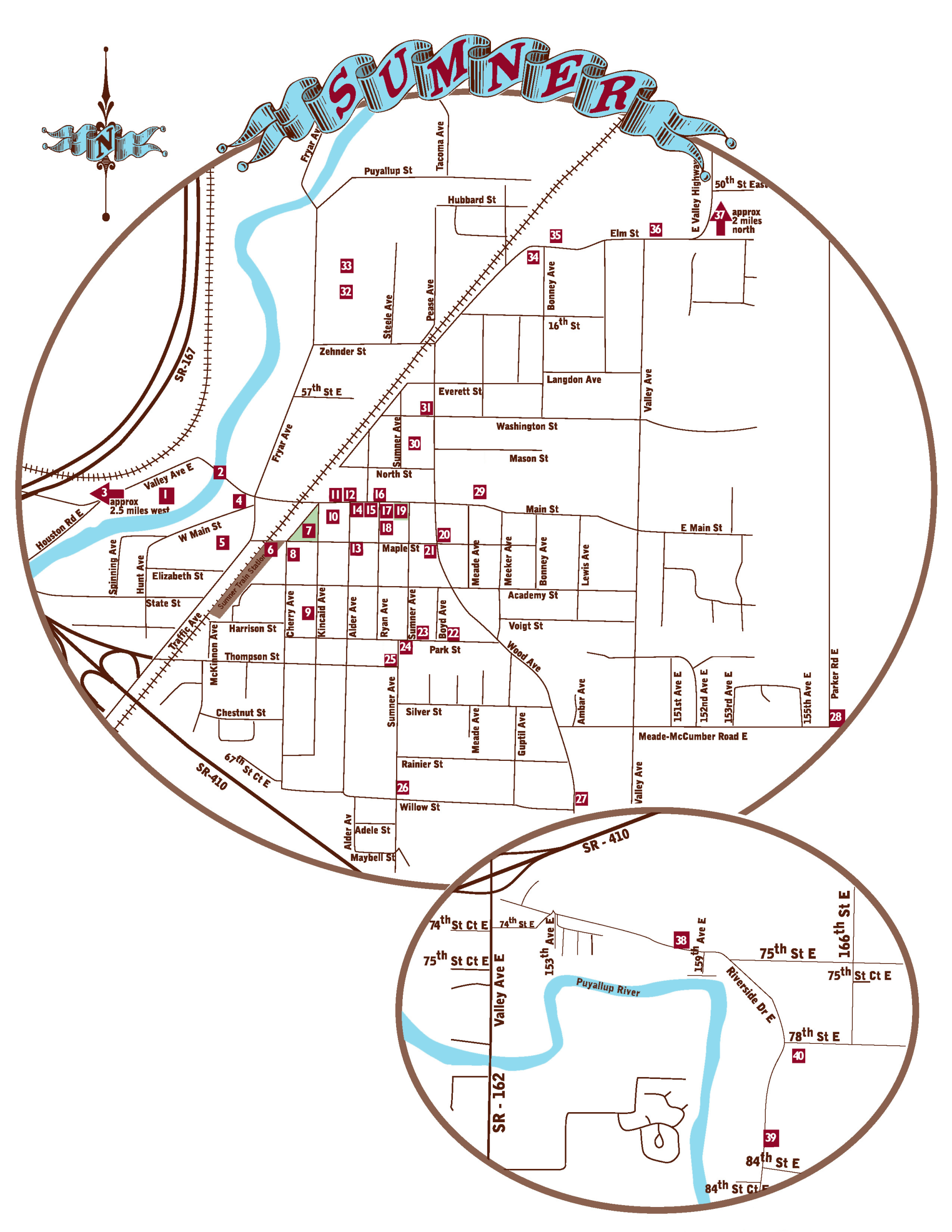 The following Historic Walking Tour is built on the tour the City has had for years. We’ve recently worked to diversify the stories to include more people and places. History is the story of who we are as a community. Even this expanded version provides only a snapshot of the people and places who have contributed to the area now known as Sumner. Please use this as a starting point to explore more history through the Sumner Historical Society, the Washington State Historical Society and other organizations who specialize in providing history.